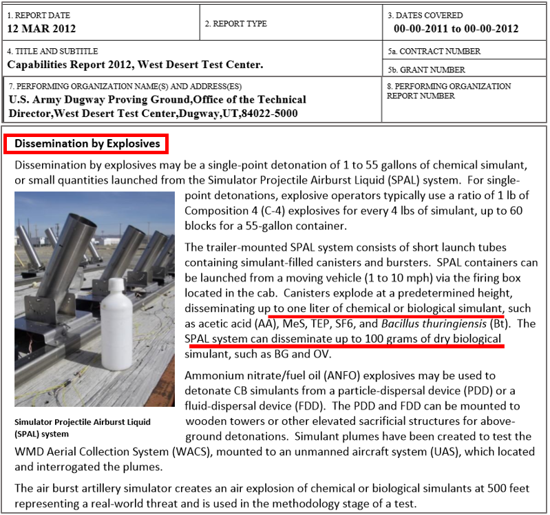 Documentos e fotos do Exército dos EUA mostram que o Pentágono desenvolveu vários métodos de disseminação de ataques de bioterrorismo, inclusive por meio de explosivo