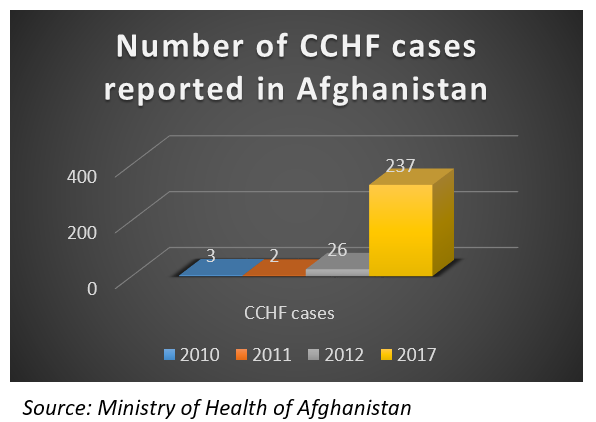 237 casos de febre hemorrágica da Crimeia-Congo (CCHF) também foram relatados em todo o Afeganistão, 41 dos quais foram fatais em dezembro de 2017. De acordo com o Ministério da Saúde do Afeganistão, a maioria dos casos foi registrada na capital Cabul, onde 71 casos foram registrados. relatados com 13 mortes, e na província de Herat, perto da fronteira com o Irã (67 casos).